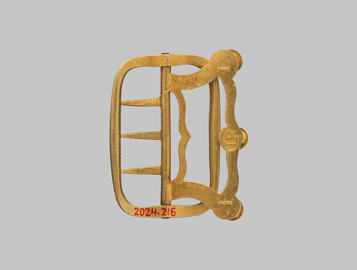 Worn on shoes, belts, the knees of breeches, and at the back of the neck, buckles served as functional and decorative accessories as well as valued emblems of wealth and good taste in eighteenth-century America. Silversmith Joseph Richardson, a prominent member of Quaker society in Philadelphia, furnished fine silver and goldwork to affluent clients. While he carried buckles with flamboyant motifs, including repousse scrolls and leafage, this plain gold buckle, with its restrained curves and unadorned cross bar, expresses a sober prosperity. The reverse bears Richardson’s maker’s mark together with the engraved initials, IC, possibly for Joseph England, member of a landowning Quaker family known to have patronized Richardson’s shop. Its scale and shape suggest this was a stock buckle, used at the back of the neck to secure a man’s stock—a long, narrow scarf worn as a collar around the neck.