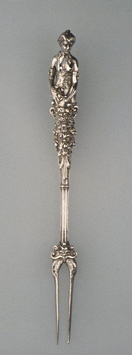 Designed to sit comfortably in the hand, the handles consist of ornamented bases supporting half figures of satyrs. Crisp details, such as the snakes that frame the spoon’s shell-shaped bowl, contribute to the utensils’ sculptural quality. The set’s precious material and sophisticated decoration indicate that it was made for an affluent household. (See also companion fork and spoon, 47.52.2 and .3.)