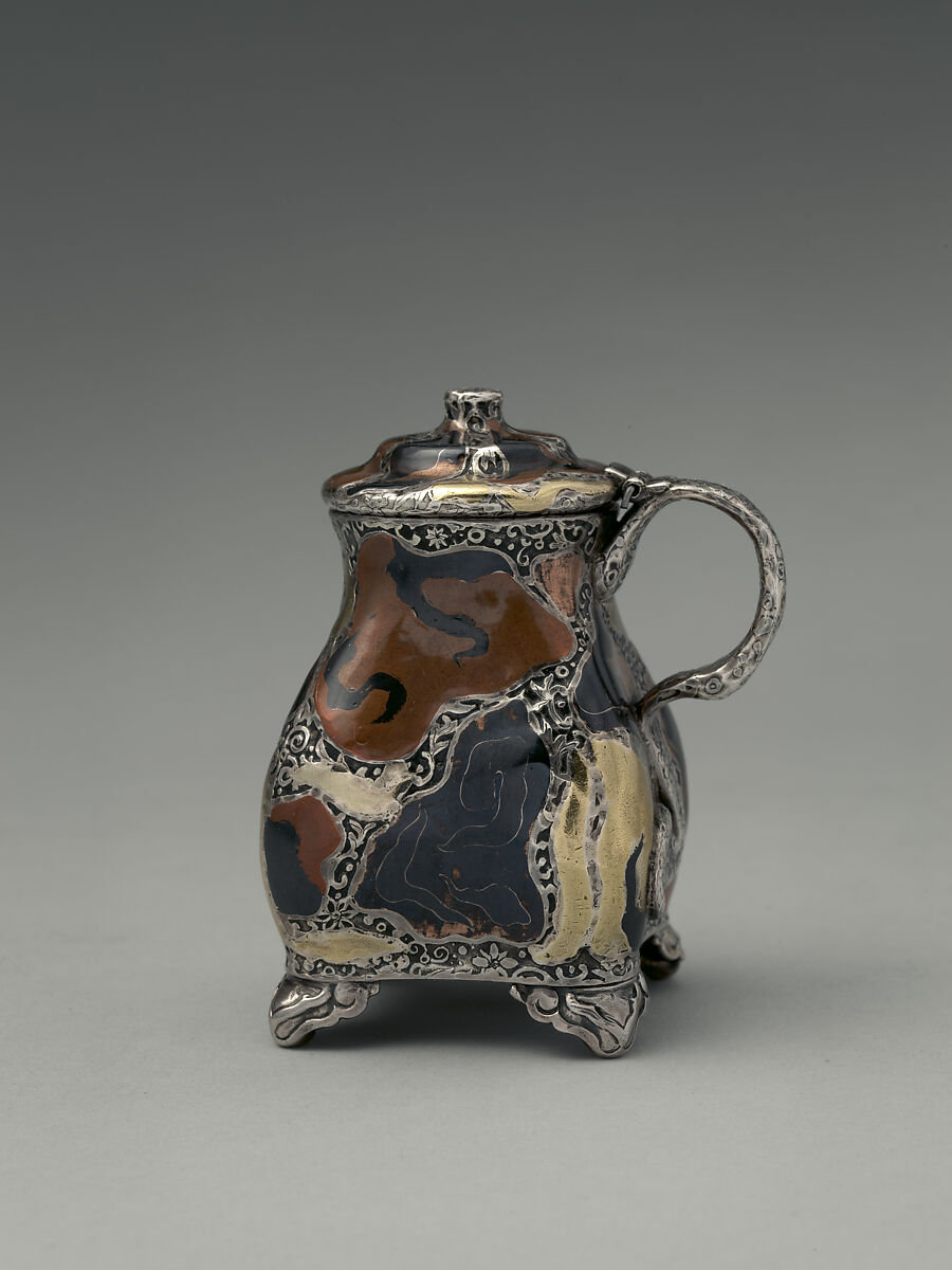 Following the opening of Japan to the West in the 1850s and the subsequent display of Japanese art at international expositions, the Japanese taste began to captivate American consumers. In response, designers such as Edward C. Moore at New York’s Tiffany & Co. introduced a range of objects inspired by Japanese art works, including ceramics, metalwork, textiles, prints, lacquerware, and netsuke. The decoration on this mustard pot is particularly unusual and innovative. Its baluster form is completely transformed by the asymmetrical inset panels of mixed metal alloys—one of patinated copper and gold (a direct attempt to imitate Japanese Shakudō), and another of patinated copper, platinum, and iron—enclosed by scrolled "Snake Skin" borders. The mottled, multicolored surface also evokes the swirling array of colors observed in Moore's collection of ancient mosaic and core-formed glass. Labeled in the Tiffany & Co. Archives as "Mustard to go with Pepper 5493," this is one of only six decorated versions produced. The Tiffany Archives also retains the Hammering & Inlaying Design drawings for this particular version (#853), which at a cost of $35 was the most expensive iteration.