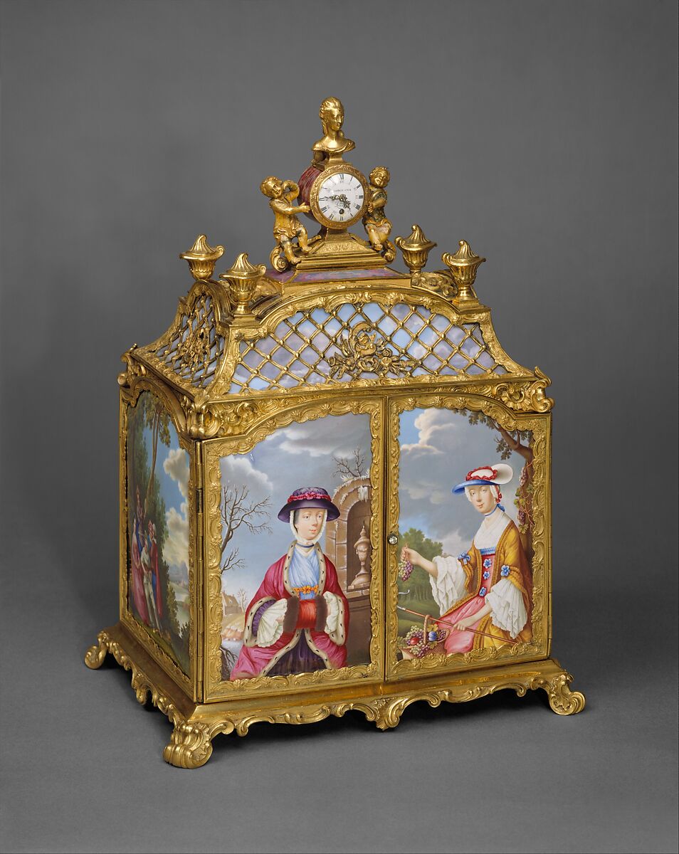 Probably made for the domestic market, the cabinet has doors that consist of enameled personifications of Winter and Summer after paintings of the Four Seasons by the British portraitist and genre painter Robert Pyle, who had a brief vogue in London between about 1760 and 1768. The anonymous enameler may have worked directly from the paintings or from contemporaneous mezzotints. The enamels on the side of the cabinet were adapted from prints of paintings by Antoine Watteau (1684–1721) and François Boucher (1703–1770). With characteristic inventiveness, Cox included a secret drawer above the more obvious drawers that is released by means of a jeweled button on the back of the cabinet. The watch is supported by two playful cherubs of cast and painted brass and surmounted by a bust of a lady.