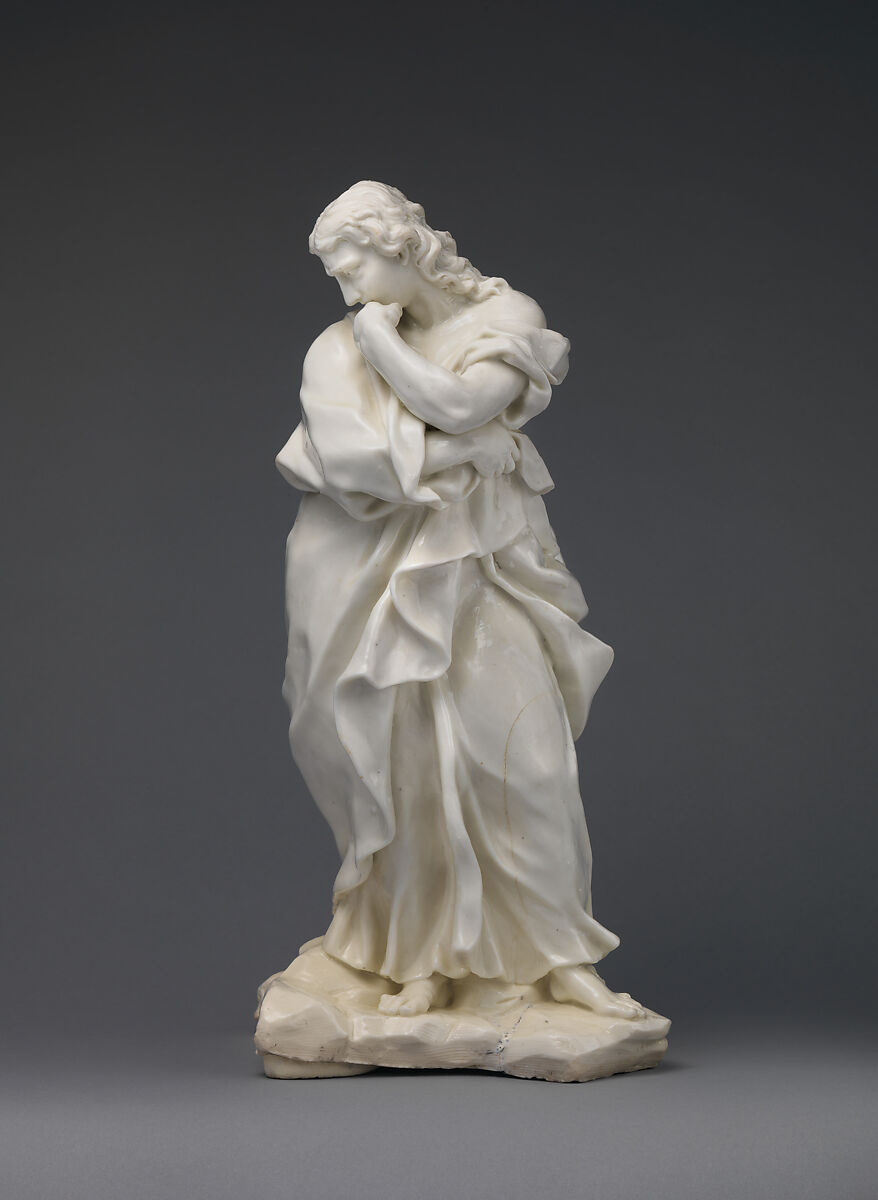 These two figures (1971.92.1 and .2) are among the most ambitious and finely modeled sculptures produced at the Capodimonte factory. The large scale of the figures is also unusual for the factory, and their successful firing represents an enormous technical achievement. The two figures were modeled by Giuseppe Gricci (1700–1770), one of the greatest of all eighteenth-century porcelain modelers, and this Mourning Virgin is the only Capodimonte figure that bears Gricci's signature.