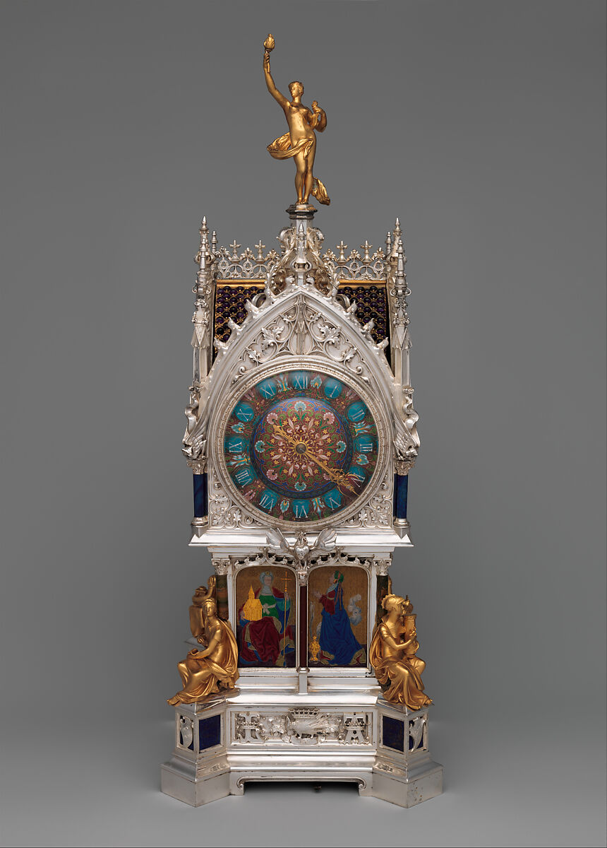 The son of Alexis Falize (1811–1898) and the second in three generations of jewelers and makers of small, precious objects, Lucien came of age in a period in which Paris became famous for luxury goods produced by such firms as Cartier, Boucheron, and Lalique, as well as Falize.[8] The clock that Falize created for Morrison is a miniature late- Gothic-style tower, but it is unlike any surviving Gothic clock of similar size. Falize may have been inspired by an actual Gothic church tower, or he may have been influenced by the structures that house clockwork inside Gothic churches. No more than fifteen years before Falize’s design, a new clock by Auguste-Lucien Verité (1806–1887) was housed in a Gothic Revival structure inside the Cathedral of Saint-Etienne Beauvais, France. More comparable to Falize’s clock in form is the housing of a timepiece that stands in the Cathedral of Saint-Jean in Lyon.[9] However, the elaborate structure above the dials of the four-sided Lyon clock is quite unlike Falize’s extravagant golden roof studded with cabochon-cut amethysts and surmounted by a svelte figure of Truth, minimally clothed in a windblown scarf. The Falize case also displays a brief compendium of heraldic references and late-medieval iconography, some of it updated to include later developments. All of it is labeled to provide certainty to the meaning of each element.[10]