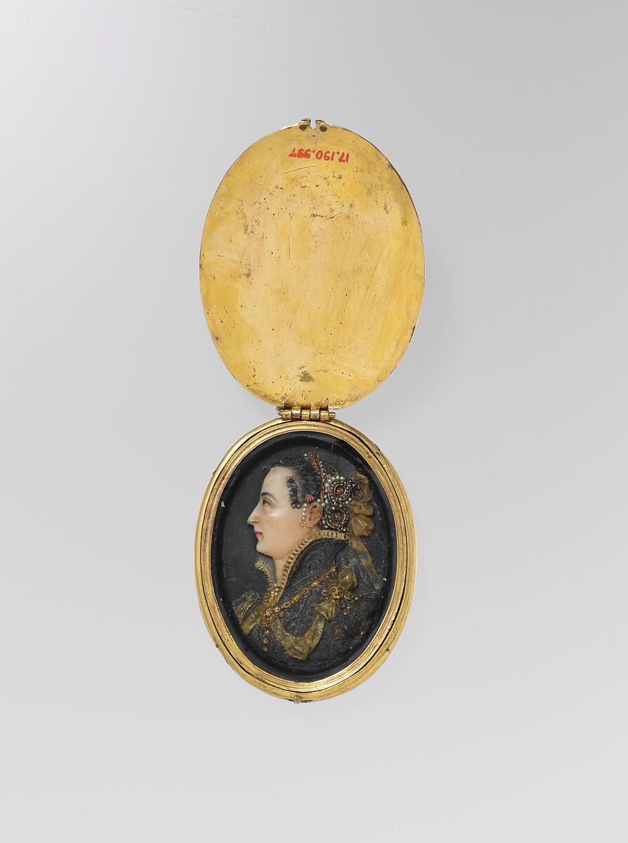 A plaster model for one side of this case was in the possession of the heirs of Alfred André in Paris in the late 1980s. The wax portrait inside also seems to have been made about the same time.