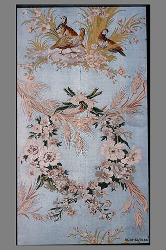 The top vignette in this panel of furnishing silk shows the abduction of the Roman goddess of spring, Proserpine, by Pluto, ruler of the underworld; the bottom illustrates one of the labors of the Roman demigod Hercules- he is slaying the multi-headed Hydra, while the serpent tries to kill him with its poisonous breath. This design was also woven in pale blue.