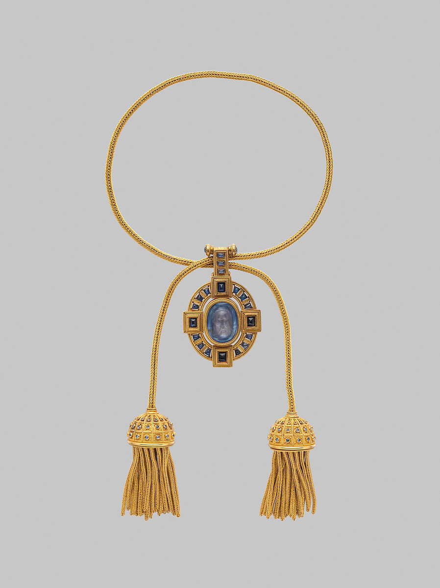 This object and the group to which it belongs (see also 2014.713.1–.10) reflect the keen interest in historical styles in nineteenth-century Europe. Artists and designers looked to various artistic periods for forms and motifs. There was also an interest in reproducing works of art from earlier epochs with historical accuracy—an approach that is particularly evident in the taste for so-called archaeological jewelry (jewelry based on excavated examples from antiquity), which reached its zenith in the middle of the century.
