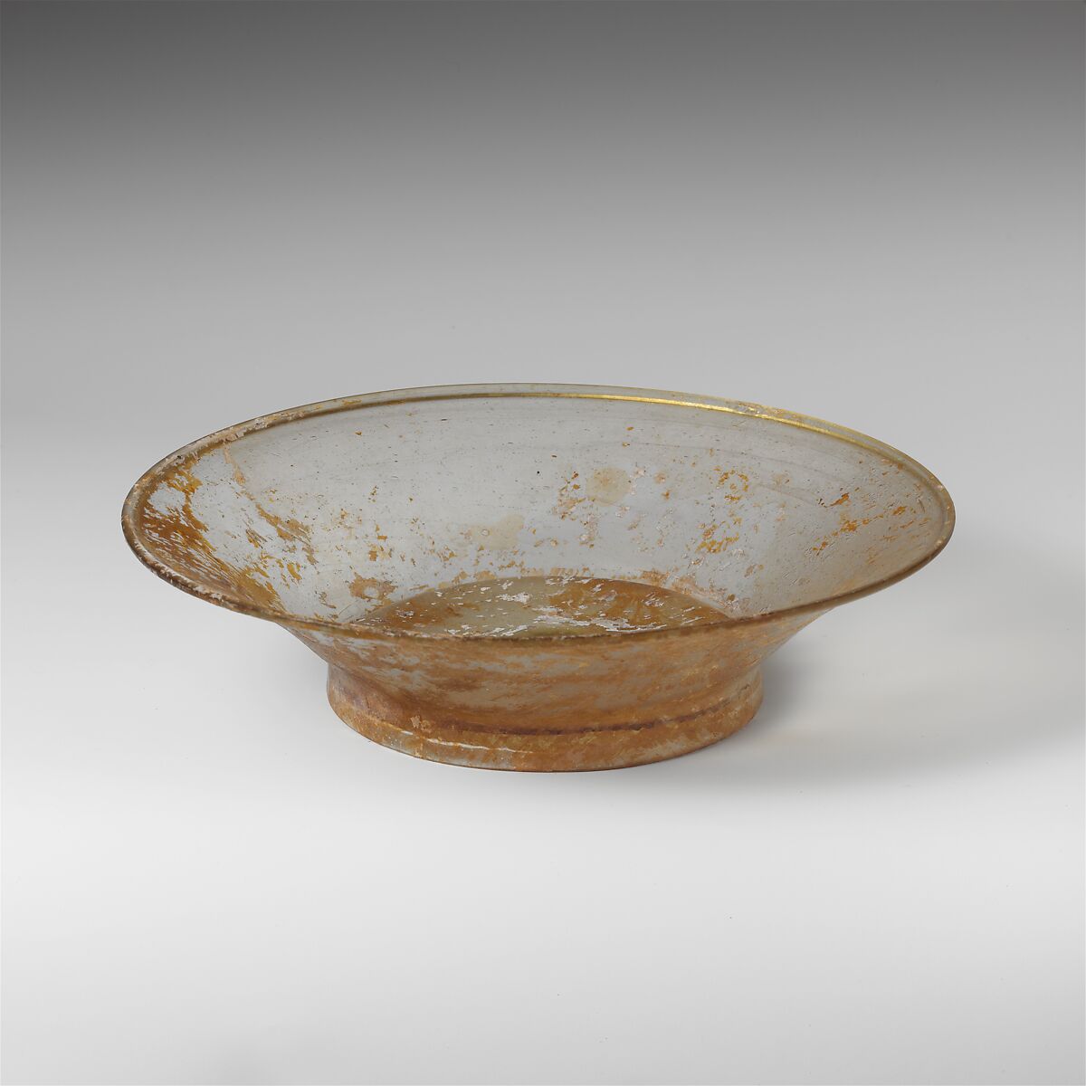 Rounded rim folded out and down; straight side to body, tapering downwards then curving slightly outward; tall, integral, tubular foot ring, made by folding with deep creease on interior; almost flat bottom with thickened dome and pontil scar at center.