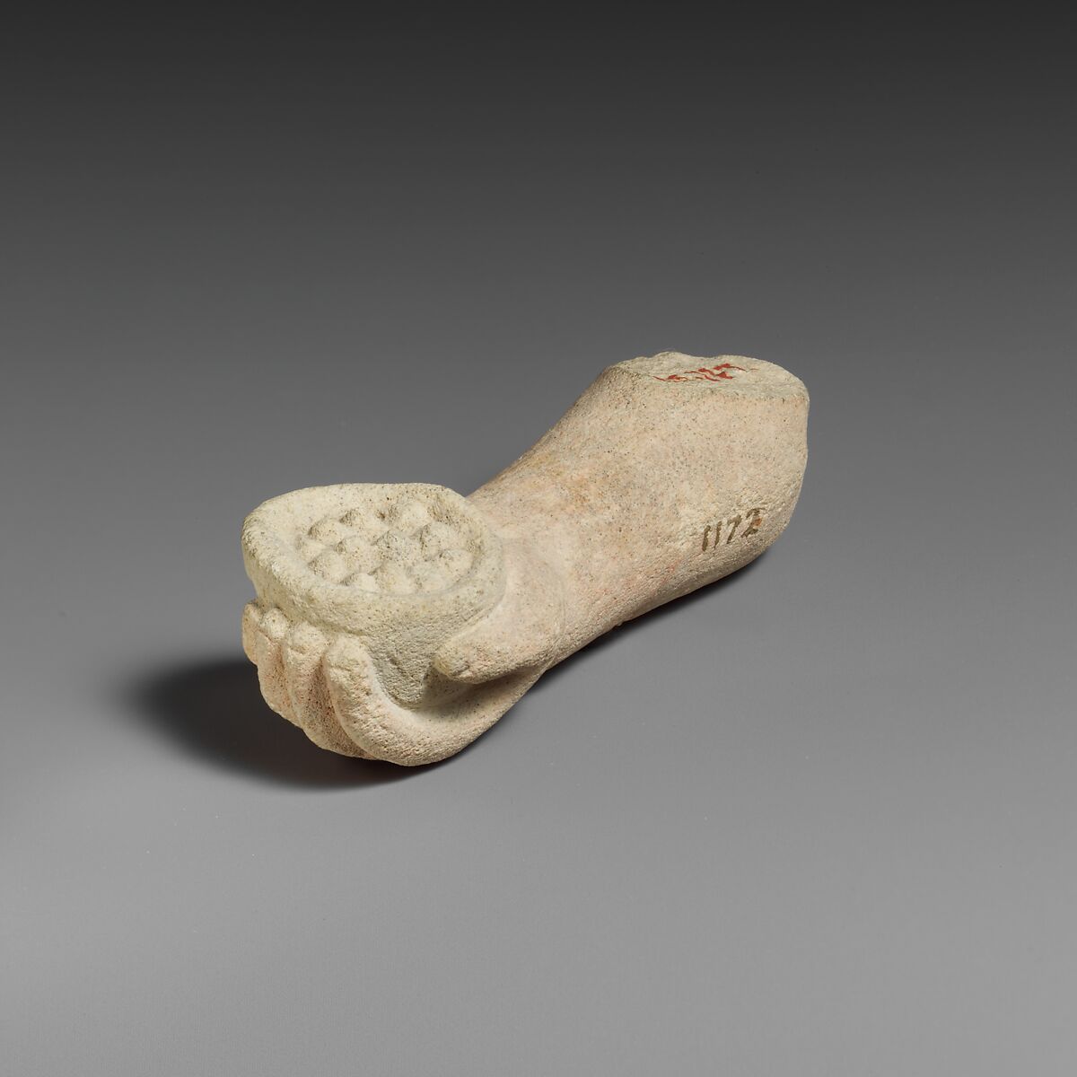 - Title: Limestone arm with pieces of fruit (?) held in the hand