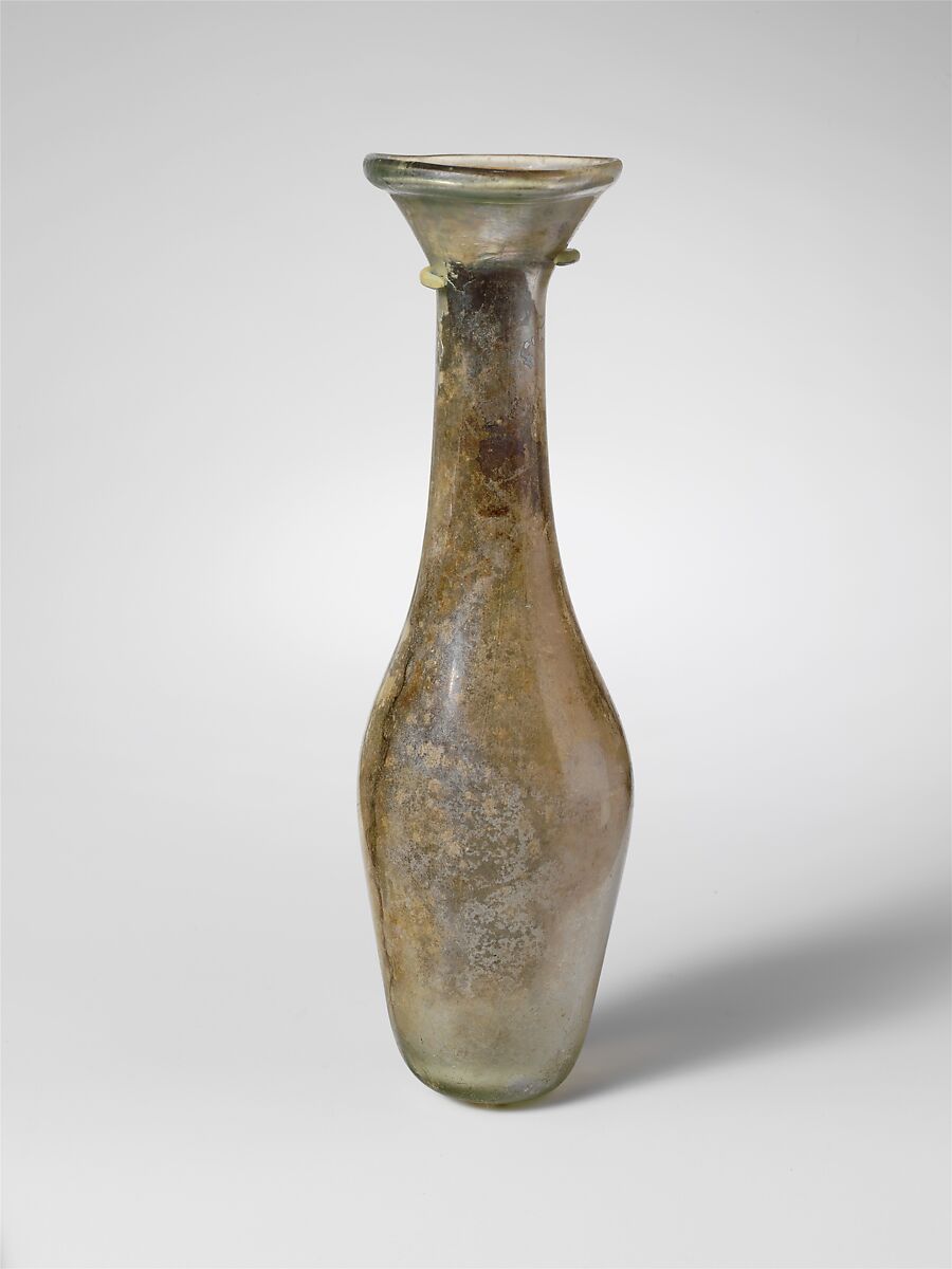 Rounded rim, folded out, up, and in; tall conical mouth; cylindrical neck, expanding downwards and joining imperceptibly with slender ovoid body; thick, rounded bottom with small central kick and pontil scar.
