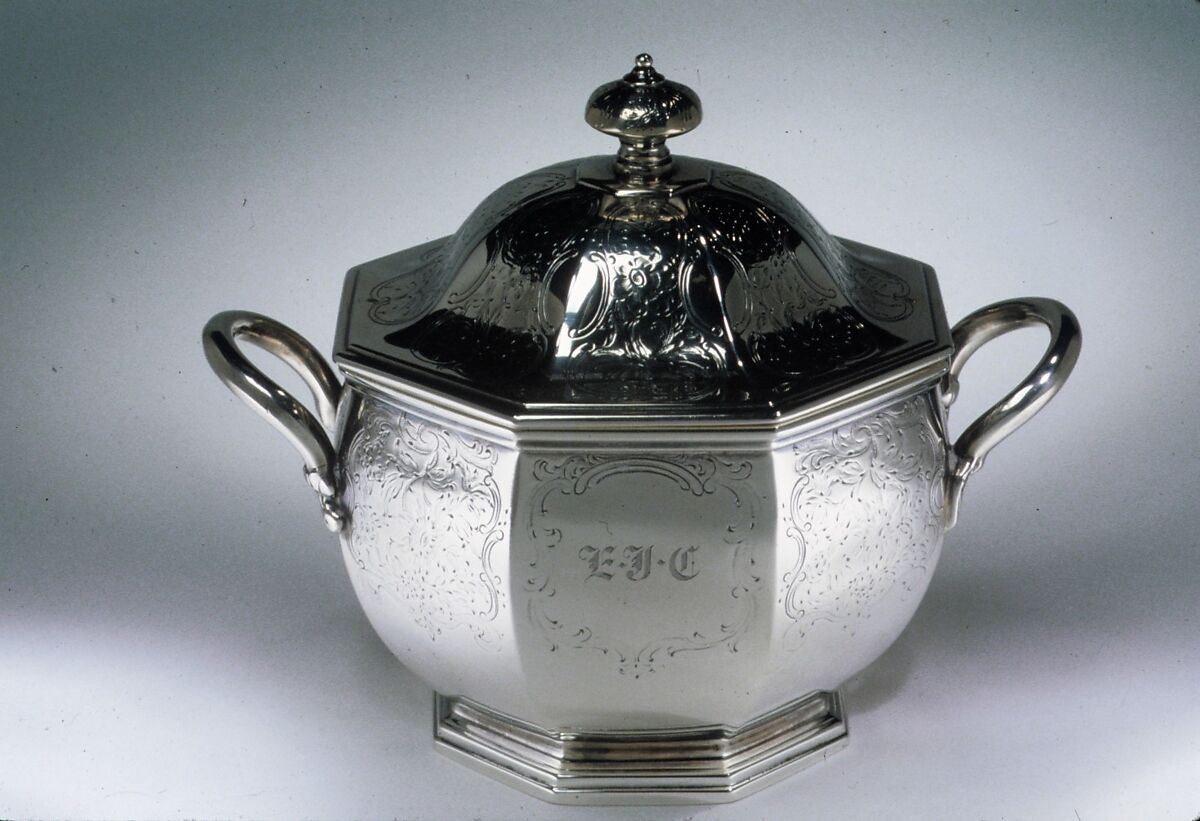 This sugar bowl belongs to the silver tea service, 1981.22.1–.7. The tea set bears the initials of Elinor Irwin Chase, the original owner. The tea set was given to the Museum in memory of the donors's mother and their grandmother, Elinor Irwin Chase.
