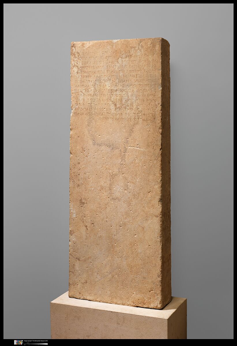 This stele once stood in a row of such monuments at the west end of the temple of Artemis at Sardis. The inscription is one of the best preserved and most important documents in the Lydian script. Although the letters are akin to those of Greek, the language itself was quite different and has not yet been completely deciphered. The inscription may be a judicial document related to the transfer of goods from an individual named Mlimnas to the sanctuary of Artemis.