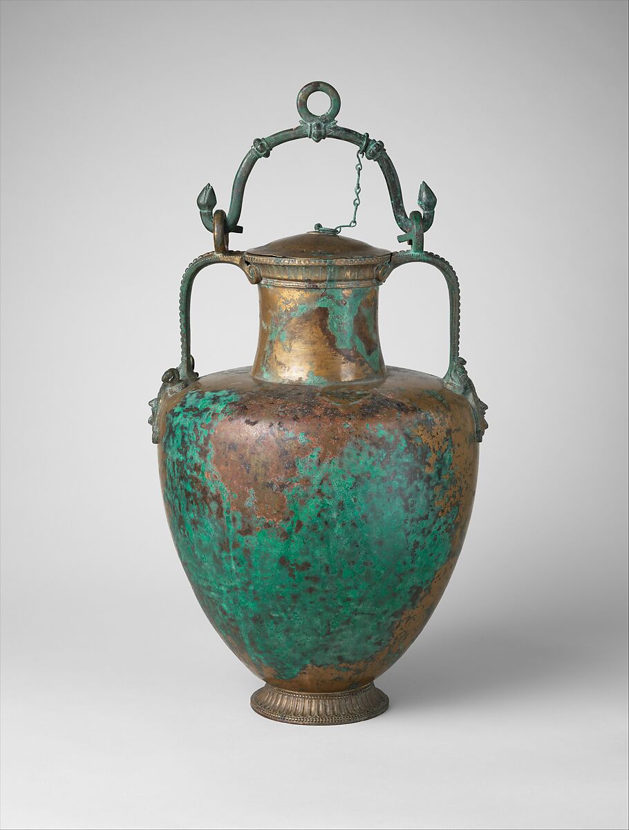 Metal vases are far more rare than their ceramic counterparts because fewer were made and because the metal deteriorated or was melted down. Only about half a dozen complete bronze neck-amphorae are known. The side handles served for pouring, the swinging bail for lifting and carrying. The embellishment here is particularly masterful—not only the Gorgon's heads beneath the handles but also the beading, tongues, and lotos buds on the foot, lip, and handles.