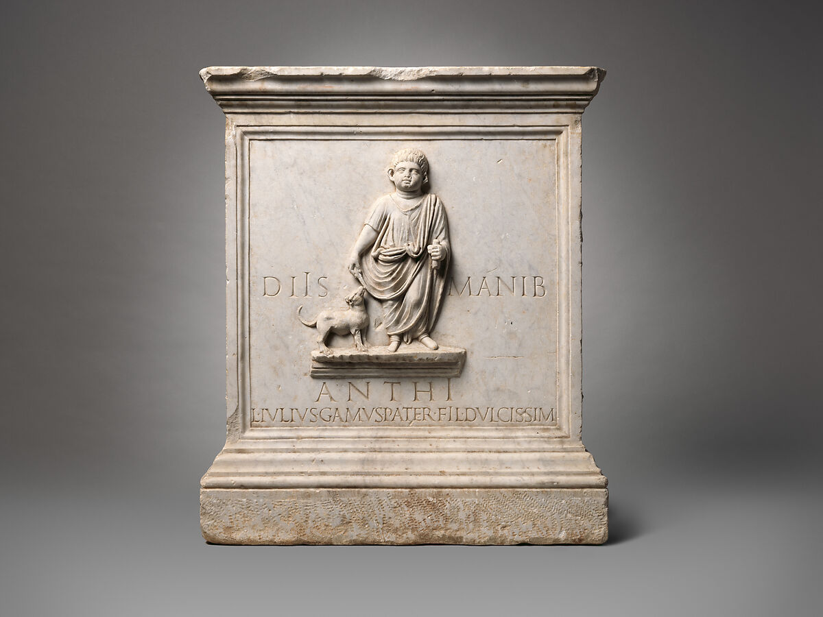 The front of the altar is carved in high relief with the figure of the deceased, named in the accompanying, elegantly carved Latin inscription as Anthus. The altar was set up by his father, L(ucius) Iulius Gamus. Although Anthus’ age is not given, he clearly died while still a child, since he is referred to as “(his) sweetest son,” and a personal touch is given to the relief by showing Anthus with his pet dog.