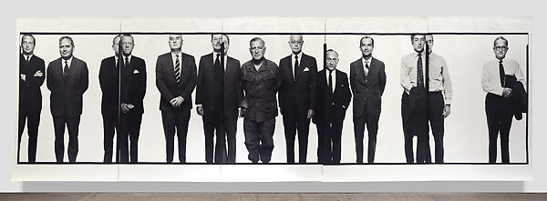 Avedon knew he would have mere minutes to photograph the U.S. generals, ambassadors, and policy experts who ran the war in Vietnam—not the weeks he spent refining his first mural. Planning in advance, he requested the heights of the men known collectively as the Mission Council and mapped out their positions, with careful attention to rank and influence. He rigged a makeshift studio at the embassy in Saigon, and recalled that once assembled, they “lined up like high school boys. They all wanted to be in the picture.” This is true of all but Ted Shackley, the camera-averse CIA station chief known to colleagues as the Blond Ghost, who begged out of the sitting for “a meeting,” leaving a void in the rightmost panel.