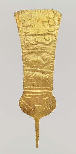 This large mask depicting a face with large upturned eyes, prominent nose, thin mouth, and ornaments below the nose and on the ears, once formed part of the funerary regalia of a deceased ruler on Peru’s north coast. Masks made of hammered sheet metal have been found in tombs of both men and women in the Lambayeque region, near the modern city of Chiclayo. Such masks are lacking perforations or openings that would have allowed mortals to see or breathe, and were most likely used exclusively to cover the faces of deceased individuals of high status. In one tomb from Batán Grande, a major center of the Lambayeque culture (also known as Sicán), one mask was found over the face of a mummy, and four others were placed at the foot of the deceased. Although such masks may have only been worn by the dead, danglers attached to the mask would have conveyed a sense of movement, perhaps life, as the mummy bundle was processed to its final resting place deep within a monumental platform mound. Only two danglers below the nose survive on this mask, although at one time many more were present, as indicated by the pairs of perforations on the ears and ear ornaments.