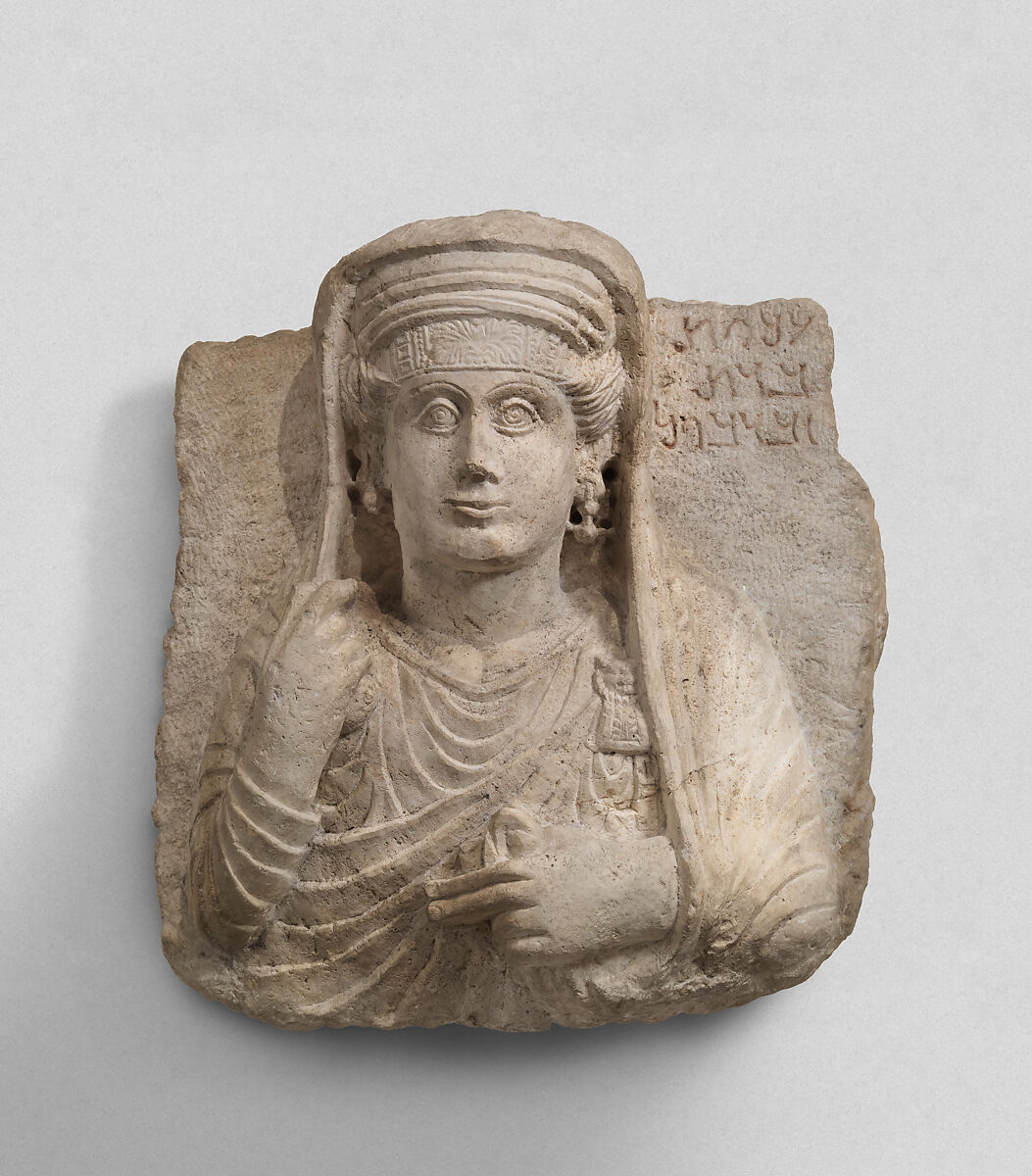 This relief is a type of funerary monument characteristic of the prosperous caravan city of Palmyra during the first three centuries A.D. Reliefs with a representation of the deceased and a short identifying inscription were used to seal burial niches in elaborately decorated communal tombs; those with a half-length or bust format became prevalent sometime after A.D. 65.
