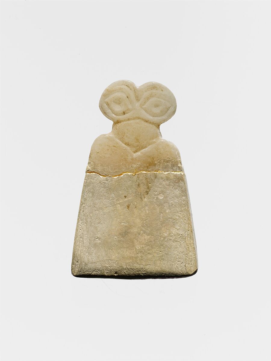 This type of figurine known as an eye idol, made of stone and having incised eyes, has been excavated at Tell Brak, where thousands were found in a building now called the Eye Temple. They were probably dedicated there as offerings. Many are incised with multiple sets of eyes, others with jewelry, and still others with representations of "children"—smaller eyes and body carved on the body of the larger idol. Wide eyes demonstrate attentiveness to the gods in much of Mesopotamian art.