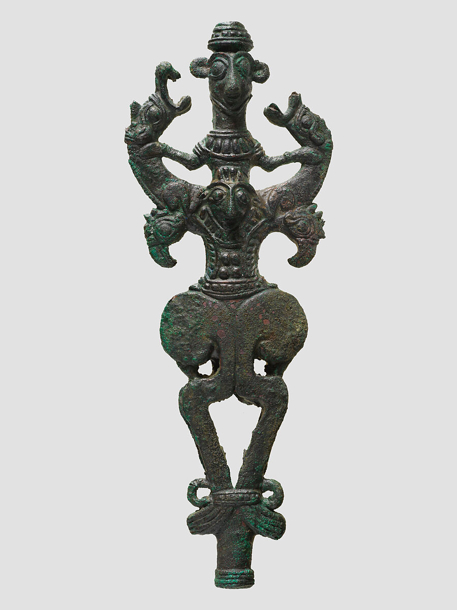 This standard top would have been joined to a pole or other support. It is not certain how such a standard would have been used, but it may be significant that this type of object has been found only in graves. The object depicts a scene of long-standing significance in ancient Near Eastern art, that of the "master of animals." The man holds in each hand the throat of a demonic creature, while human and bird heads appear below.