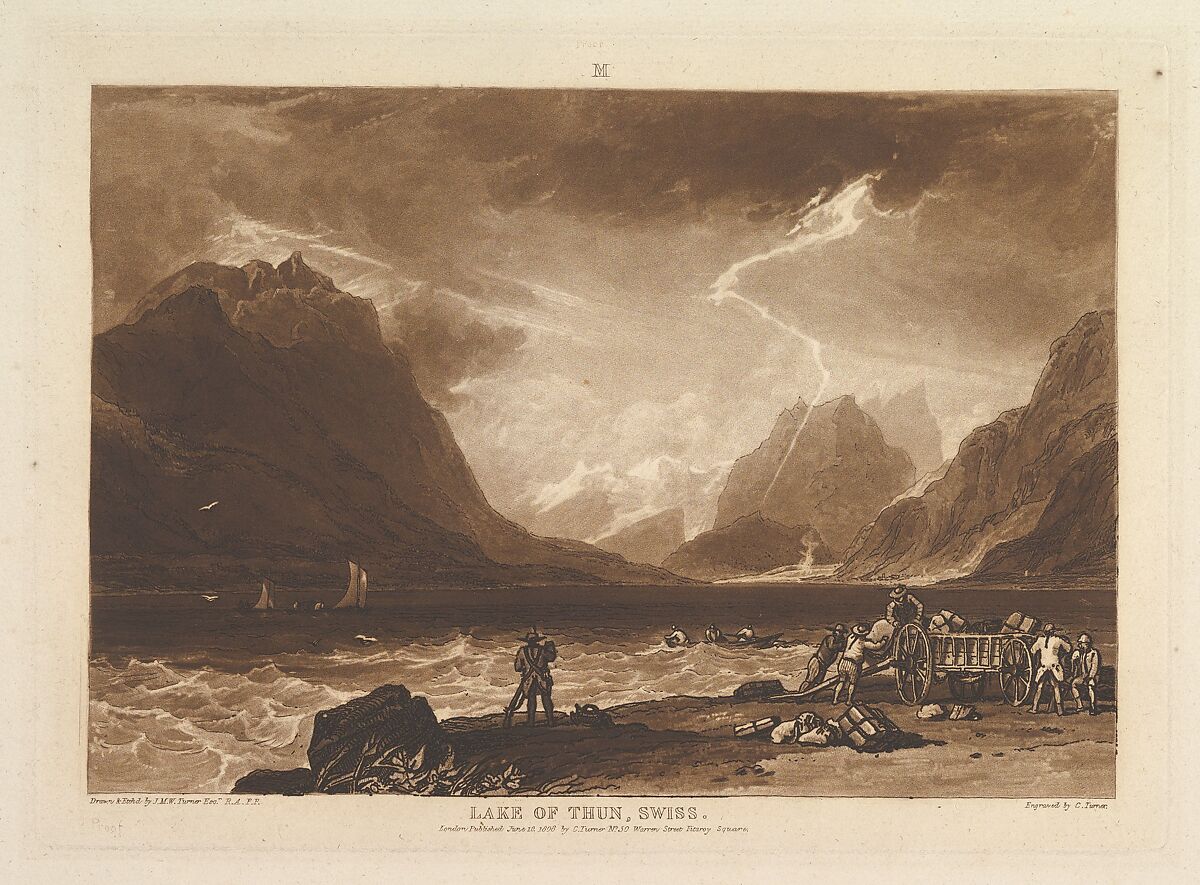 Turner distilled his ideas about landscape In "Liber Studiorum" (Latin for Book of Studies), a series of seventy prints plus a frontispiece published between 1807 and 1819. To establish the compositions, he made brown watercolor drawings, then etched outlines onto copper plates. Professional engravers usually developed the tone under Turner's direction, and Charles Turner here added mezzotint to describe a Swiss mountain lake agitated by an approaching storm, with a distant lightning strike causing figures in the foreground to hurry for cover. Mezzotint's capacity to convey the bright flash of light and its reflections on the water is used to great effect and the "M" in the upper margin indicates Turner's category of Marine landscape.