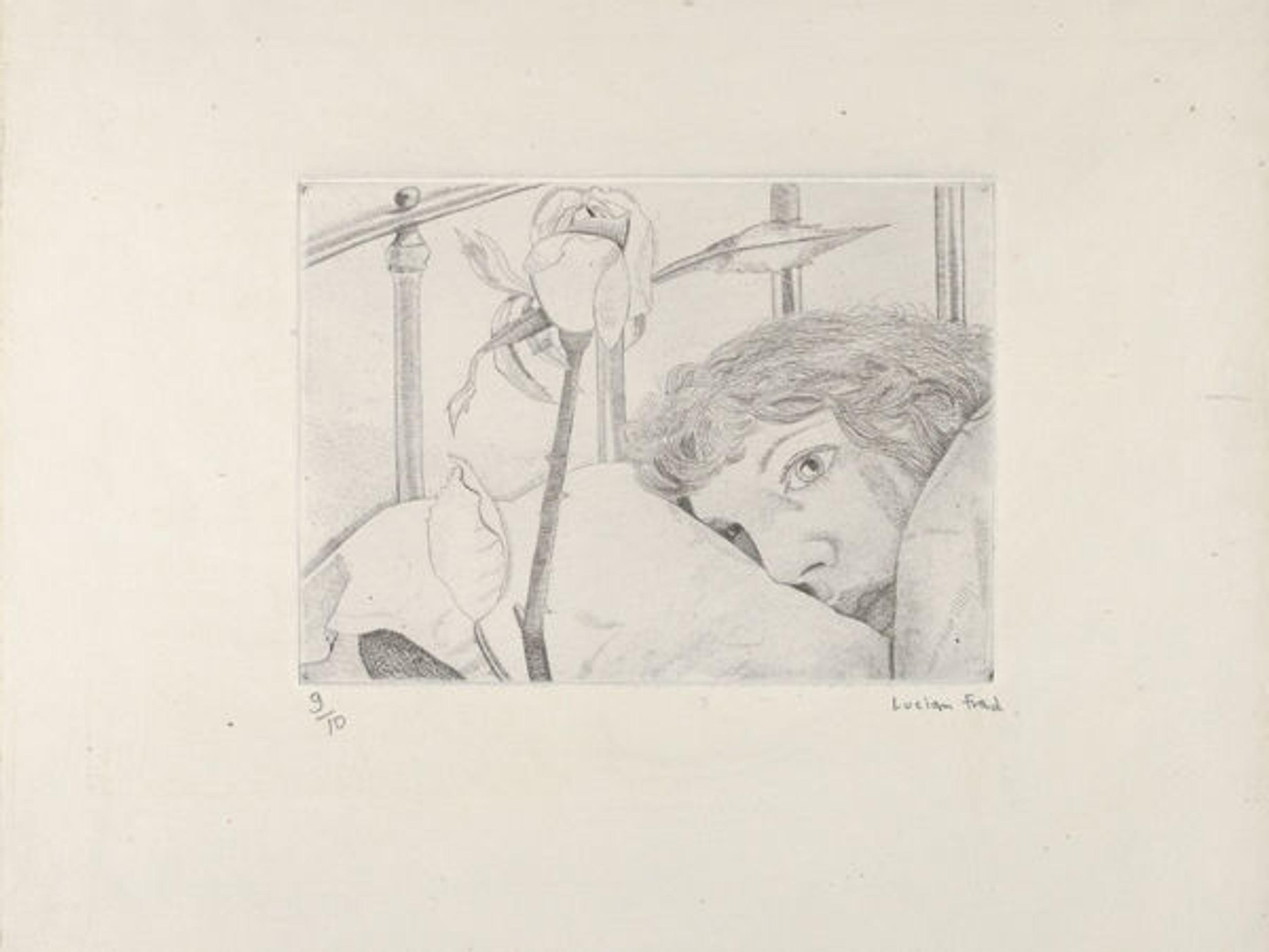 When Freud returned to etching in 1982, after a thirty-three-year hiatus, his style had profoundly changed. Instead of sharply drawn contours and narrative content, he focused on capturing the physical and emotional states his subjects revealed during intense portrait sessions, which lasted for several hours a day for weeks or even months. Freud was close with almost all the people he portrayed. His stepson Kai is shown here casually dressed against a sparse background; the simplicity of the setting contrasts with the detailed depiction of his facial features. Although he had exacting standards for his etchings, Freud embraced unintentional marks transferred from plate to print and faint lines that came from modifications to the composition.