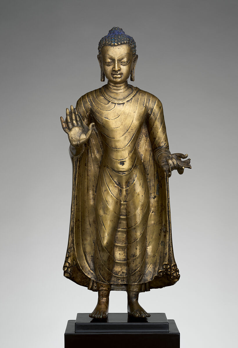 This Buddha image embodies the qualities of inner radiant calm and stillness, the products of supreme wisdom. He dispenses reassurance and protection to his followers with a raised hand held in abhaya-mudra, the ‘fear not’ gesture. The Buddha is robed in the simple uncut cloth of a monk, gracefully drawn around the body so as to define form, to create an image that is at once ethereal and sensuous. A state of Buddhahood is defined iconographically by the presence of a series of auspicious markings (lakshanas): here we see the attenuated earlobes, protruding skull and webbing between the fingers. Taken together these features, both natural and supernatural, denote preordained sanctity and a state of Buddhahood. Few metal Buddha images survived the collapsed of monastic Buddhism in the late 12th century, and most that are preserved did so in Tibet, where they had been spirited away for safety in the medieval period.