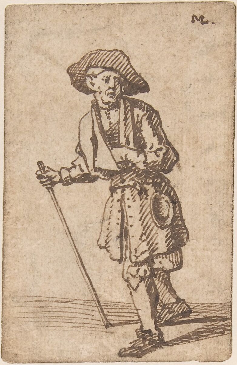 Laroon came to London from The Hague in 1674 and established himself as a studio assistant to Sir Godfrey Kneller. Working independently, he also painted portraits and drew vivid genre subjects whose unsentimental approach to everyday life anticipates William Hogarth. This small figure drawing on card likely once belonged to a large set and its style echoes engravings Laroon designed in 1687 titled "The Cryes of the City of London Drawne after the Life." Rather than an urban street vendor, however, this shows an itinerant, perhaps a decommissioned soldier with a drinking cup slung from his belt, leaning on a staff, with his hand in a sling.