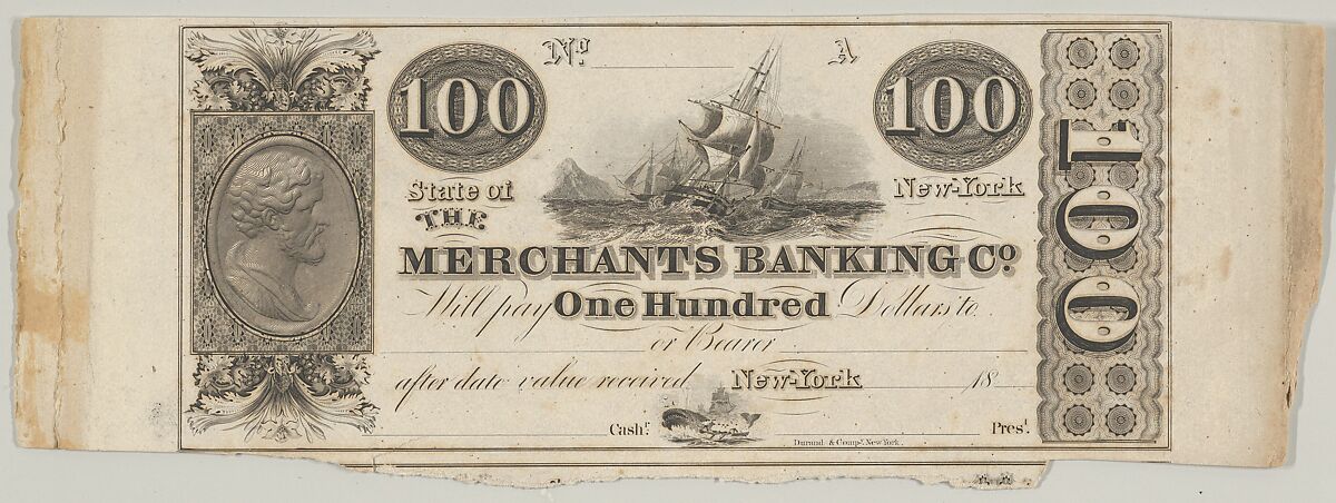 - Title: Proof of one side of a New York Merchants Banking Company 100 Dollar Bill