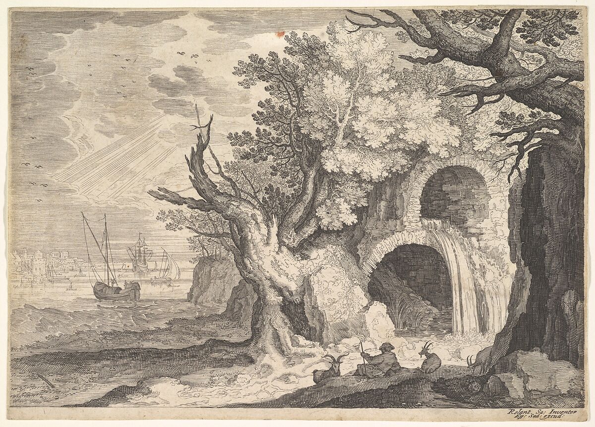 - Title: Ruined aqueduct with water spilling from it to a stream below, ships at sea beyond, a man reclining on the ground with three goats in the foreground, from "Six Landscapes in Tyrol"