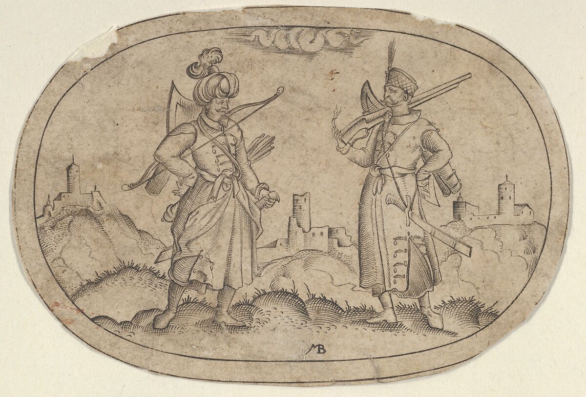 A Turkish man with a bow and arrow, at left, greets a Polish man with a rifle over his shoulder, at right. Castle ruins are seen in the distance at center. From a set of 12 plates of vessel designs.
