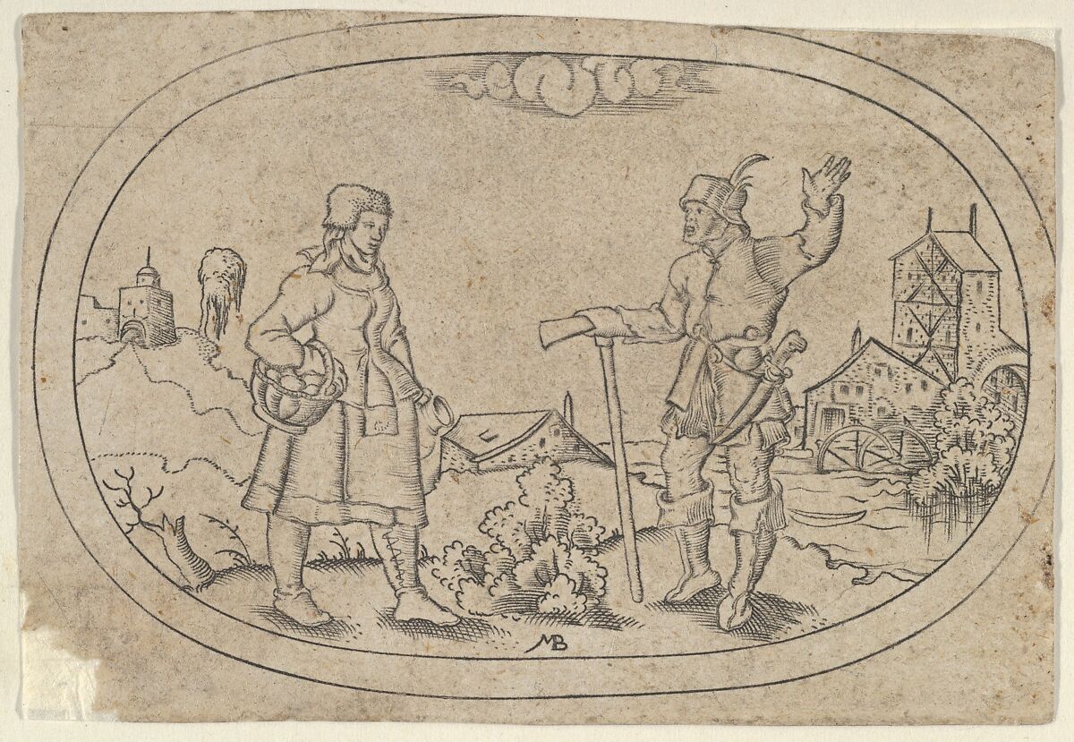A male farmer at right greets a female famer, who carries a full basket at left. From a set of 12 plates of vessel designs.