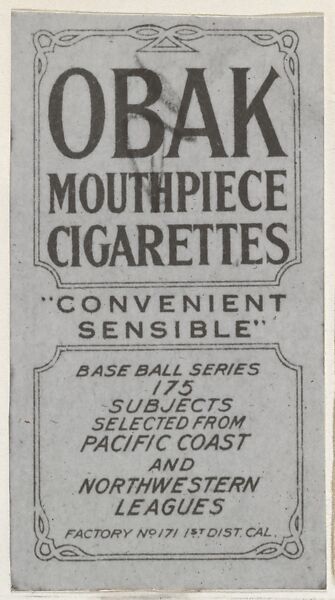 - Title: Facsimile of Card Verso, from the "Obak Baseball Players" set (T212), issued by the American Tobacco Company to promote Obak Mouthpiece Cigarettes