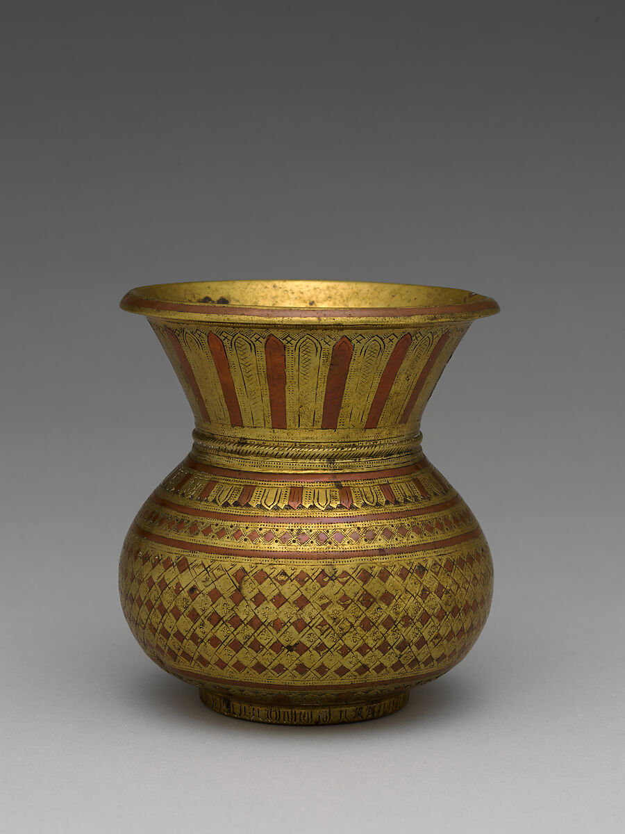 This lota, or water container, is probably based on earlier models of seventeenth-century India that also survived after the beginning of British rule in the region. Its checkerboard pattern, perhaps derived from early Hindu decoration, reflects Islamic influence as well—specifically, the prominance of geometric patterns in the Islamic world. The square unit exists not only in the checkerboard design but also as a repeated sequence of diamond shapes in the band above the vessel's belly. The technique of employing brass and copper together on the same object, unique to India, is called ganga-jumna, after the contrasting colors of the Ganges and Jumna rivers. The Museum's lota most likely was made in Thanjavur, known for its superior brass production in the nineteenth century.