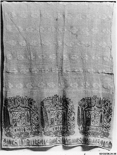 - Medium: Linen, silk, metal-wrapped thread, and tinsel; plain-weave, supplementary warp loops in the central panel (terry cloth), and embroidery