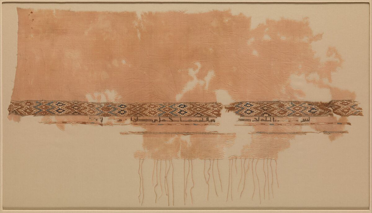 In the medieval period, Yemen had a flourishing textile industry and both Umayyad and Abbasid caliphs established factories there. The large and prosperous city of Sana'a, to which this textile is attributed, was one of the most important centers of Yemeni textile production. The Arabic inscription under the lozenge-patterned band reads: "In the name of God. Blessing from God. Of what was made in the tiraz of Sana'a." The "tiraz of Sana'a" mentioned in the inscription refers to the workshop in which the textile was made, reflecting the convention of using the word (which literally means embroidery) to describe both textiles like this one and the workshops in which they were made.