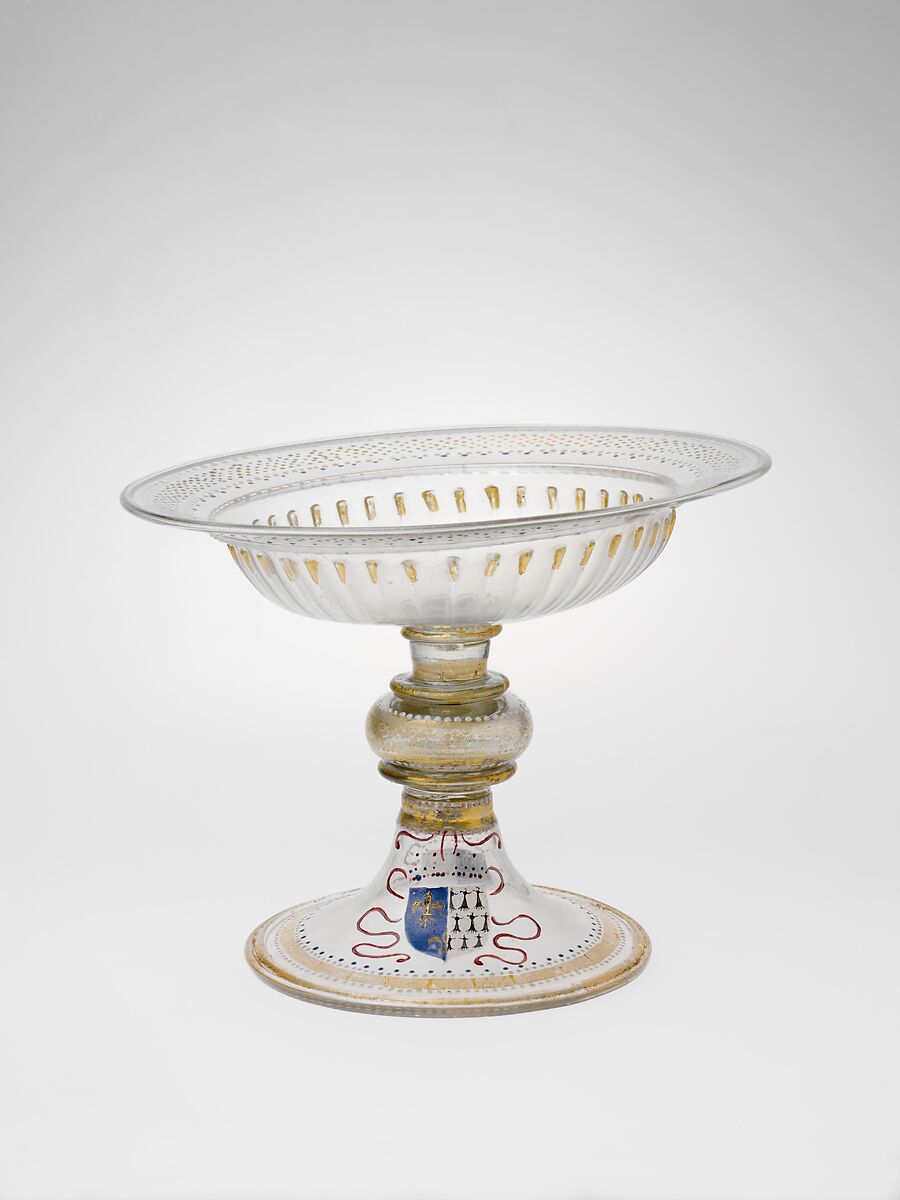 This tazza bears the coats of arms of Louis XII of France (1462–1515; r. 1498–1515) and Anne, duchess of Brittany (1477–1514). It is believed to have been part of a service made to celebrate their marriage, which took place in 1499. Three other pieces from this presumed service are known. French glassmakers were able to emulate Venetian examples of the period; though the tazza form originated in Venice, technical evidence suggests that the Lehman piece was manufactured in France.