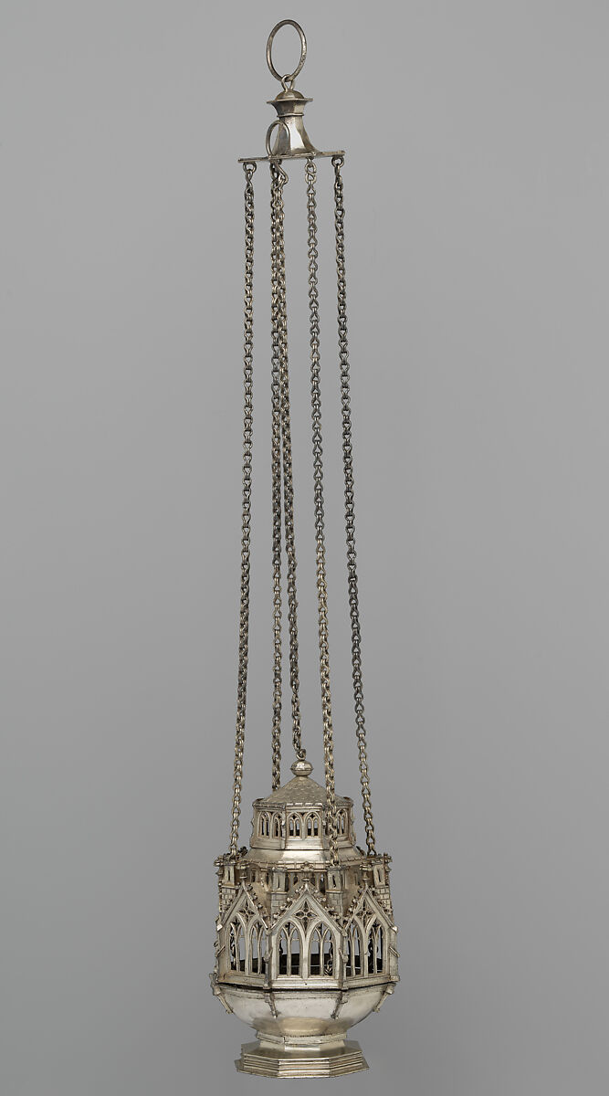 The architectural conceit well suits the function of the object, as the generous fenestrations allow air to fire the incense coals while providing an escape for the perfuming smoke. The four chains threaded through every other tower support the vessel; raising the fifth chain by the ring elevates the entire upper section, allowing for the addition of incense.