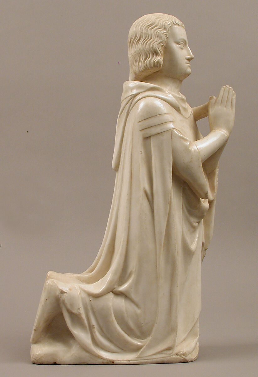 These royal donors in prayer may have belonged to an altar or a tomb. Based on comparisons with contemporary portraits, the statuettes may portray Philip VI Valois (d. 1350); his second wife, Blanche of Navarre (d. 1398); and one of their sons, John the Good or Philip of France.
