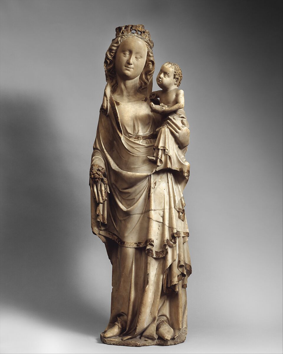 The Virgin is shown with a crown and scepter as the Queen of Heaven. Her scepter, depicted as a rose branch, alludes to the homily of the Virgin as the rose without thorns (or without sin) or as the rose of Jericho that sprang up at the resting places of the Holy Family during the Flight into Egypt. The dove held by the Christ Child represents peace, purity and the Holy Spirit. This work, with its elegant proportions and horizontal, looping drapery folds, is related in style to a large sculpture of the Virgin and Child given to the abbey of St.-Denis in 1340 by Jeanne d'Evreux, the widowed queen of Charles IV. Her tiny book of hours can be found in The Cloisters Treasury.