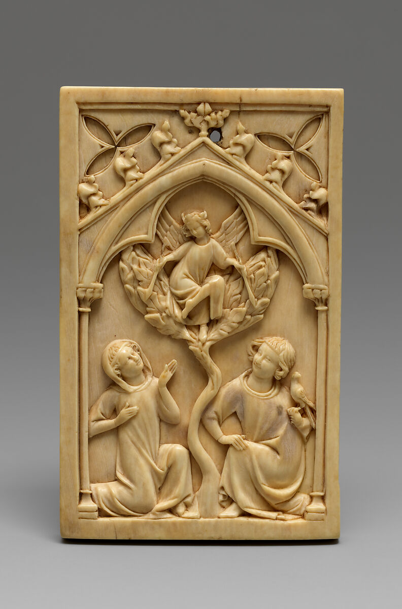 Intended to cover writing tablets, such plaques were among the deluxe products of Paris during the fourteenth century and were possibly made on the rue de la Tabletterie, a name indicating their special use. Poems or messages would have been written on smooth sheets of ivory that had recessed areas filled with wax for the text. Perfect economy of technique and purity of style are clearly evident in these amorous images. In their elegance of form and gesture the courtly couples seem also to convey a moral and spiritual life that appears both mannered and artificial but is infused with joie de vivre.