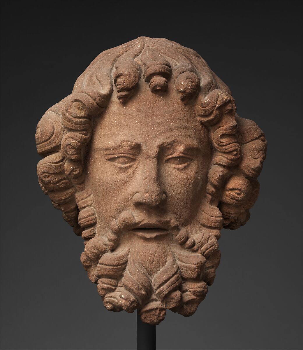 With its curly hair and furrowed brow, this arresting head bears comparison with the prophets on the central portal of the west facade of Strasbourg Cathedral, which was carved a generation after the Virgin (47.101.11) displayed in this gallery. The red sandstone is typical for that region. Although the head certainly belonged to a column figure, it is unknown whether it was part of the sculptural program of Strasbourg Cathedral or of another church in that city.