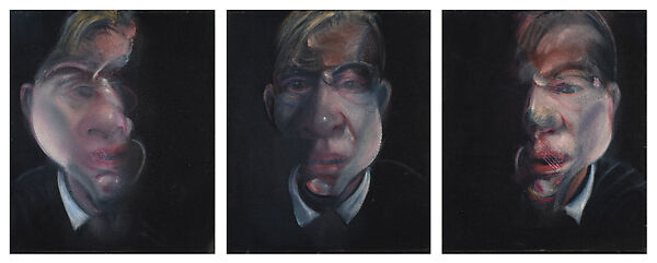 As Bacon remarked to British art critic David Sylvester in 1975, "I loathe my own face . . . I’ve done a lot of self-portraits, really because people have been dying around me like flies and I’ve nobody else left to paint but myself." This striking triptych, featuring a head emerging from a deep abyss of black paint, provides no sense of the space inhabited by the sitter. The tightly constricted view allows only for ruminations on the face itself—its ravages, its psychological depths—and the sense of the head turning around slowly, going from one frame to the next, as if in an unhurried panning shot.