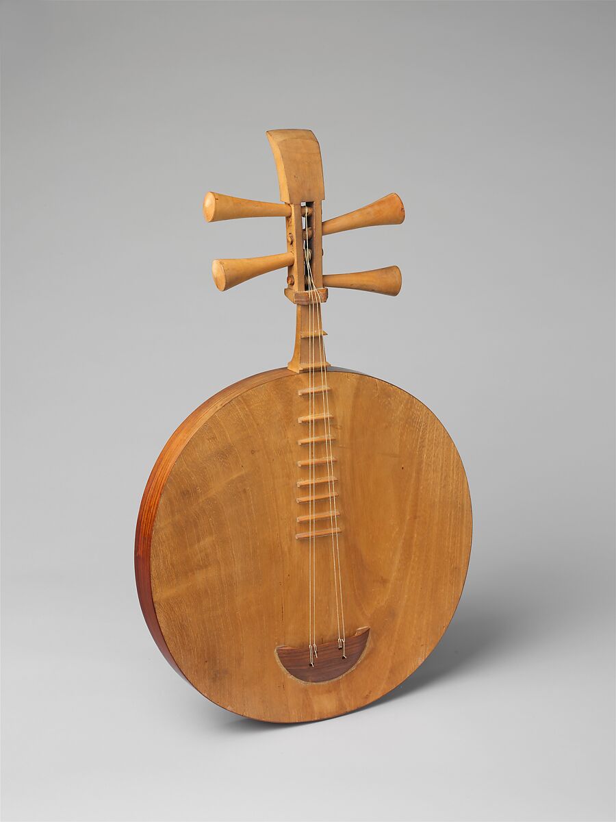 The resemblance of this round lute to the full moon (yue) gave it its name. The yueqin developed from a much larger long-necked lute that appeared in the Qin and Han dynasties. Its four strings are tuned in pairs, a fifth apart. Like the sanxian, it encloses a vibrating plate. Found in popular ensembles and the Beijing opera and used to accompany song, the yueqin has not been fully embraced by the modern Chinese orchestra. The player presses the strings between the high frets making chord playing difficult but giving increased control over the timbre and intonation. Strings are plucked with fingernails or a pick using up- and down-strokes and tremolo techniques that sustain and give color to a tone.