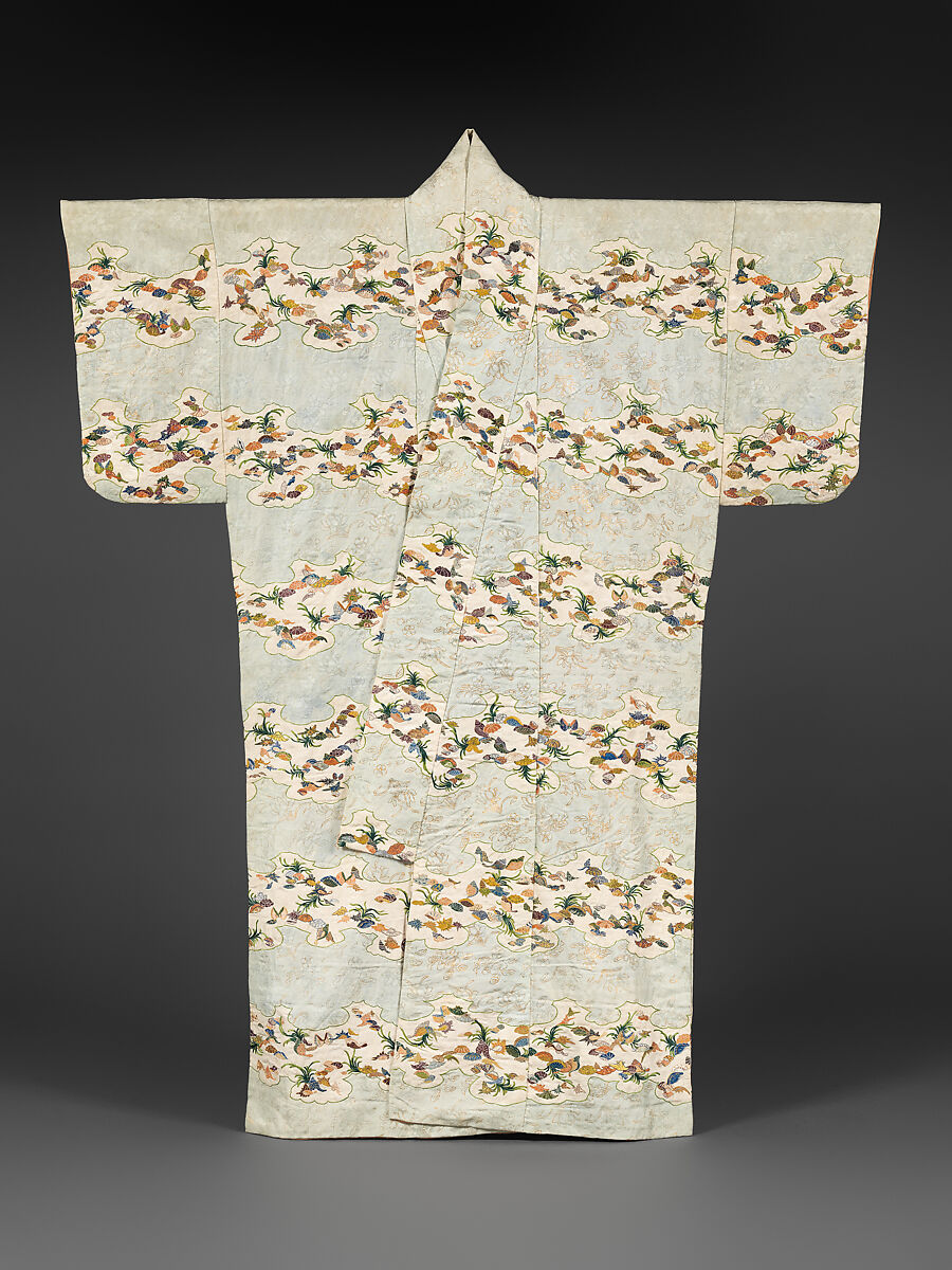 El delicado diseño bordado de este original kimono (kosode) se inspira en el paisaje de la costa japonesa, y las conchas y algas marinas que se encuentran en sus playas. La tela del kimono, adamascada con dibujos florales sobre un fondo de entramado, fue importada de China. Una vez en el Japón, se usaron tintes con reserva sobre la tela blanca para conseguir un efecto de bancos de arena irregulares sobre los que se bordaron diseños marinos. Acentos de pan de oro hacen resaltar los dibujos florales de la tela adamascada azul pálido.