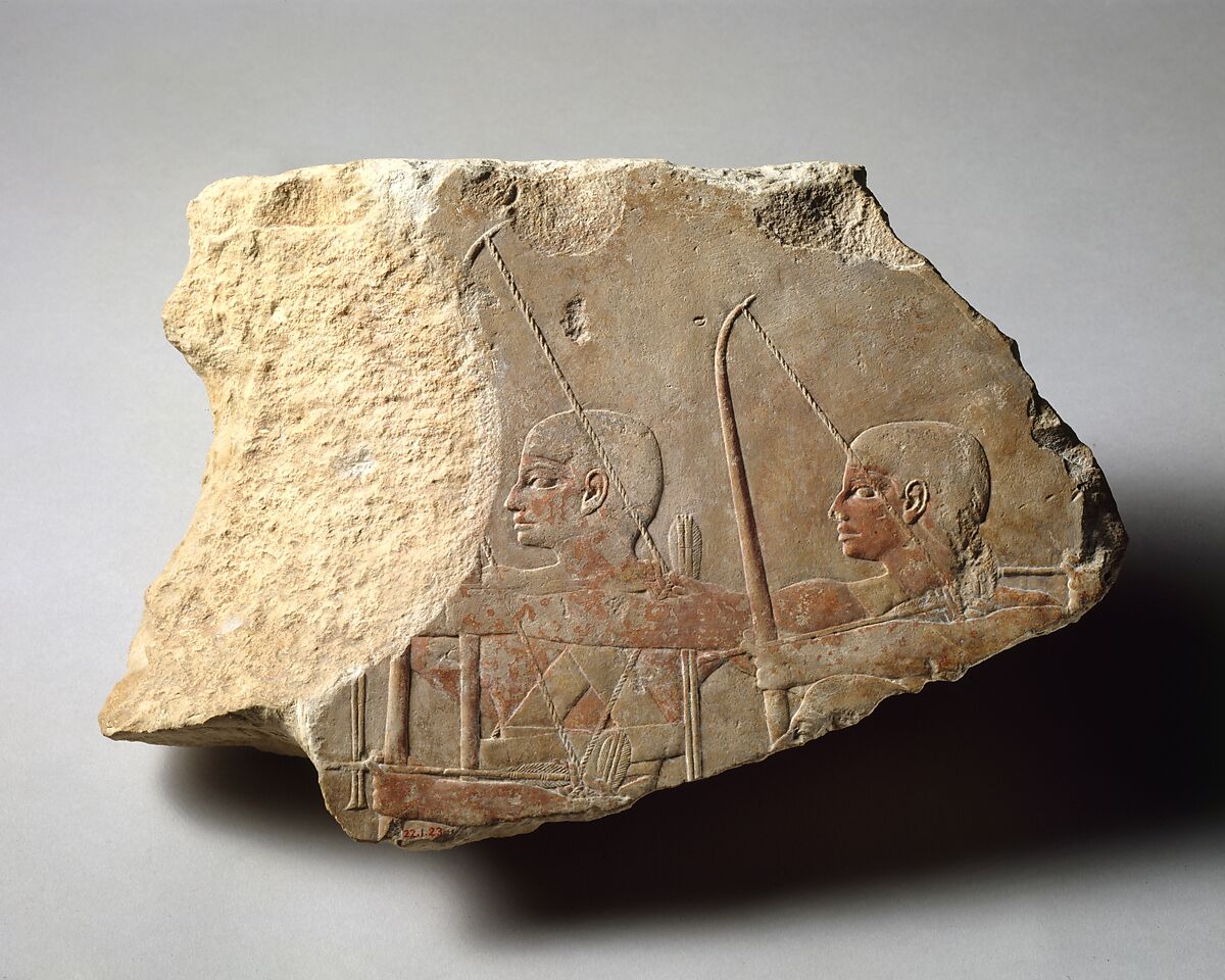 This fragment of relief shows one of the most elaborately composed scenes preserved from the Old Kingdom. A careful examination reveals parts of at least four archers, three standing and one kneeling below them, his extended left arm and the upper part of his head just visible along the lower edge of the fragment. Each man has his left arm stretched in front of him, the left hand grasping the shaft of a long bow with the thumb and last three fingers, while the index finger keeps an arrow steady. With his right hand, each archer draws the string of the bow, with the notch of the arrow set against it. Each man also grasps two extra arrows in his right hand.