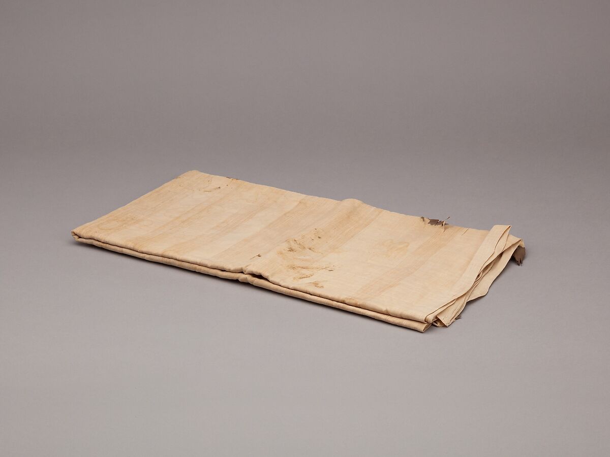 This folded length of cloth is a shirt made of fine, closely woven linen. The stripes in the fabric are created by slightly darker warp threads. The width and distribution of the stripes is not uniform suggesting that the effect is accidental - perhaps a function of aging.