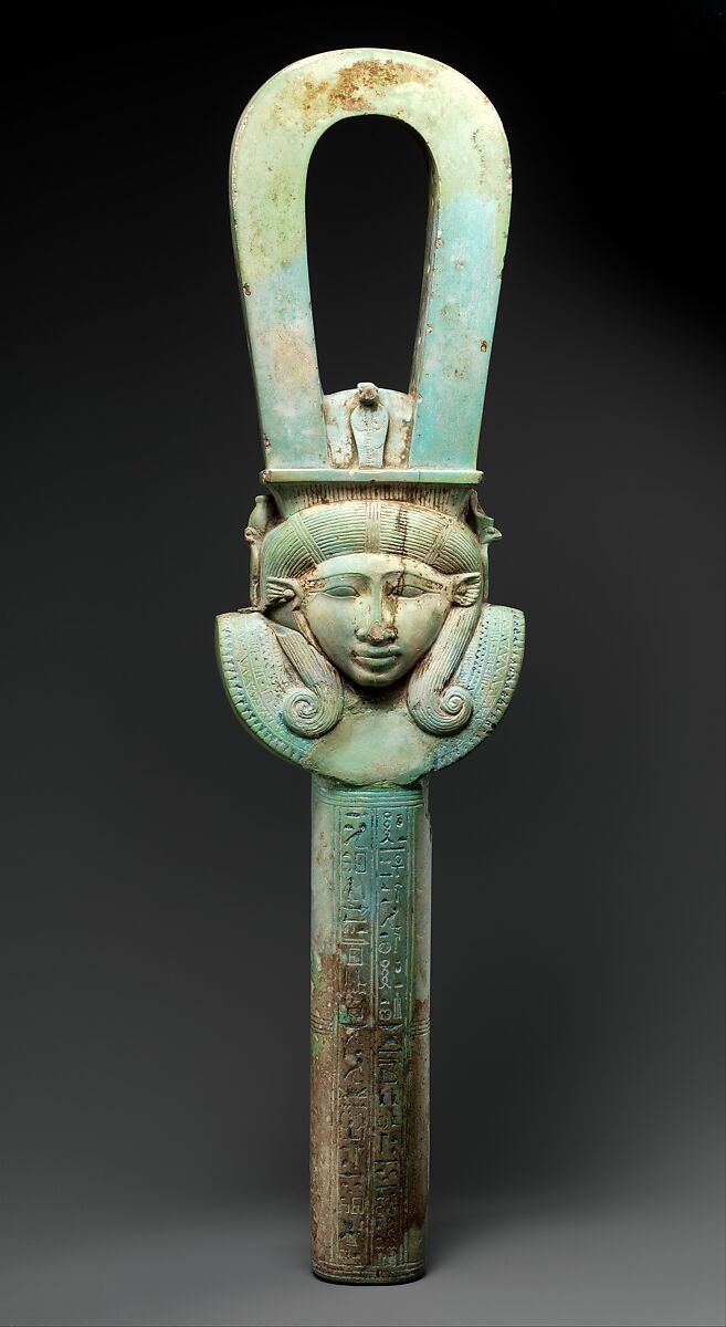 The arc sistrum only appeared as of the 18th dynasty. The inscription on this one draws from hymn that seems to accompany sistrum-playing, known from several versions. The accumulation of epithets suggests the hymn originated with a Theban Isis (further associated with Coptos and Min), and was adapted for Hathor too.