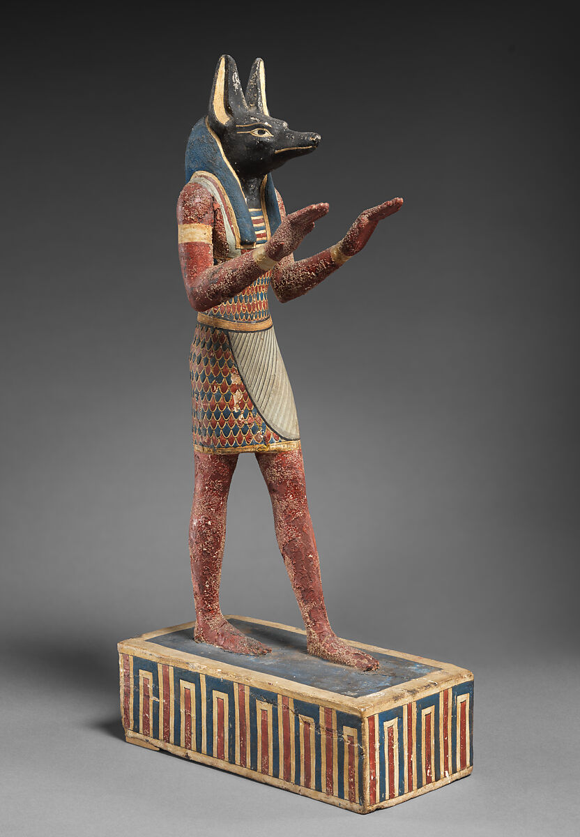 Among the several canid-headed gods that existed, Anubis was the most prominent and is likely the deity represented in this exquisitely carved and painted statuette. The god stands atop a pedestal decorated with a niched façade. His elaborate tunic has a feather pattern and is overlapped by a hip drape. The drape is painted with stripes of two different shades of green that create an impression of different depths. While one might want to see these stripes as a depiction of pleated linen, an almost identical statuette in the Roemer- und Pelizaeus-Museum, Hildesheim (1582), clearly shows them as long, layered feathers. The parallel piece in Hildesheim must have been produced in the same workshop.