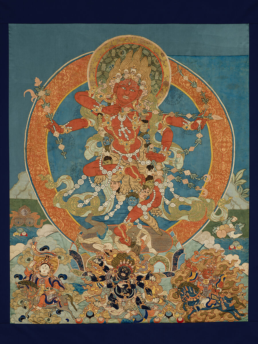 This large-scale appliqué depicts the Vajrayana goddess Kurukulla, known as a beautiful bewitcher of men. The four-armed figure’s red skin corresponds to her status as an emanation of the red Amitabha Buddha. Kurukulla is evoked for success with tantric rituals; reciting her mantra allows the practitioner to subdue or bewitch men of all ranks, even kings. Typical of late images of this deity, she shoots a bow with a flower-tipped arrow like the god of love, Kamadeva. As with many ferocious female protectors, she is presented with a headdress of skulls, wearing bone ornaments, and dancing on a pile of corpses. A garland of severed heads frames her body. Below is a group of fierce protectors. This appliqué is an outstanding and well-preserved example of Tibet’s textile image-making tradition.