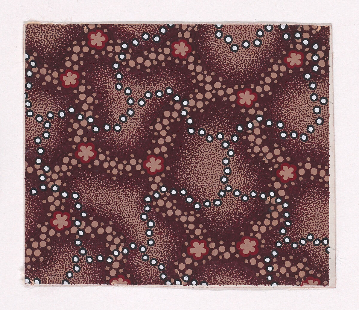 Rectangular sheet of paper with a textile design from a group, dated 1840, made in Mulhouse, Alsace, which was an important nineteenth-century center for textile production in the Haut-Rhin region of France. The design is made up of interlacing strips of pearls over interlacing garlands of dots of light tan color and rosettes and with offsetting shades of dark reddish-brown color, over a light tan ground with stipples of dark reddish-brown color. The pearls are of white color. The rosettes have five petals and are of light tan color with red outlines.