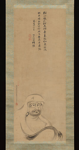 Hotei, a popular figure in the Zen pantheon, is often depicted as a rotund, good-humored monk carrying a large sack. A semihistorical figure, he is believed to have lived in southern China in the late ninth century and was eventually recognized as a manifestation of Miroku, Buddha of the Future. The poetic text here, from a eulogy for Hotei by the Chinese Daoist Bai Yuchan (1194–1229), was inscribed by Tetsuzan Sōdon, a leading monk-scholar who served as abbot of the Zen monastery Myōshinji in Kyoto.