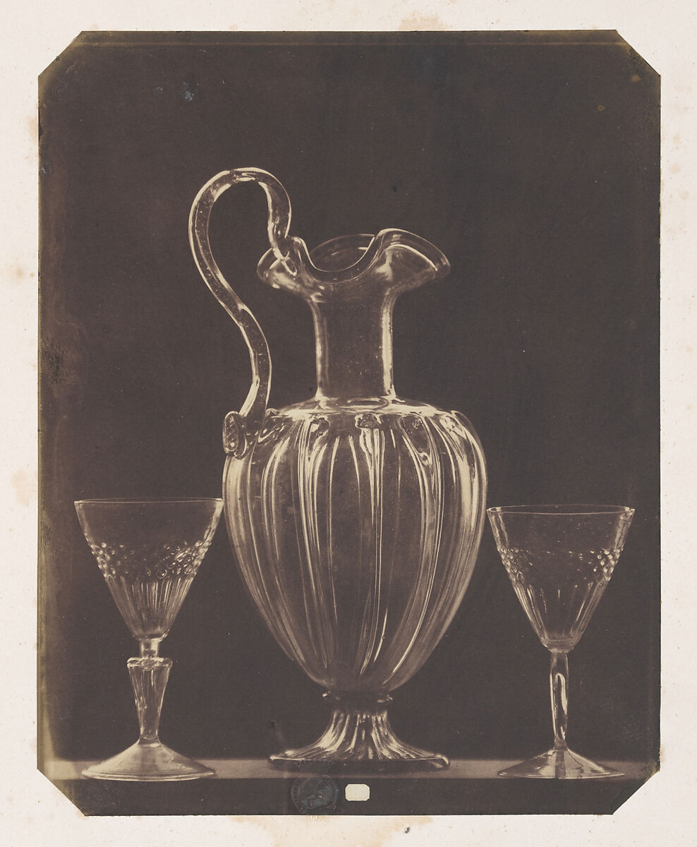 Stamped in Latin on the back of this print, the words "Sincerely and Truthfully," act as a guarantee: before us is an allegedly unadulterated image of indisputably real things. Veracity was critical to Ludwig Belitski, who was hired to document the decorative arts collection of a Prussian baron. In exactly the sort of project prefigured by Talbot’s Articles of Glass (exhibited nearby), he depicts this glassware with extraordinary precision, preserving a model for future makers. This and other photographs in his series were circulated among local craftsmen for study. Belitski illuminates these vessels before a dark backdrop, bringing translucent details into focus. The resulting view is as worthy of emulation as the objects themselves.